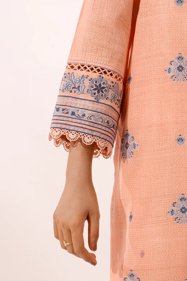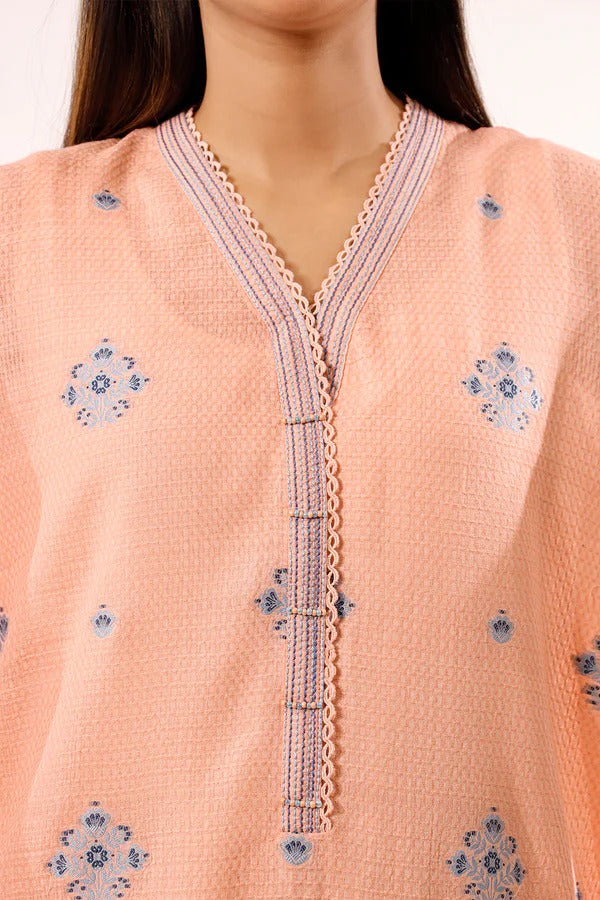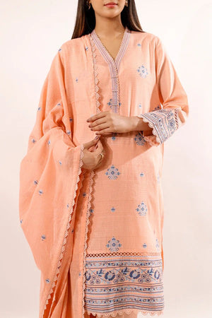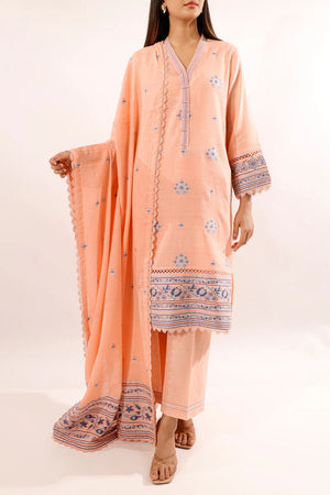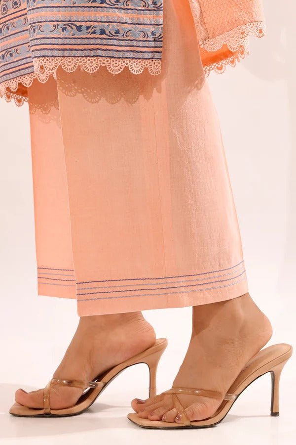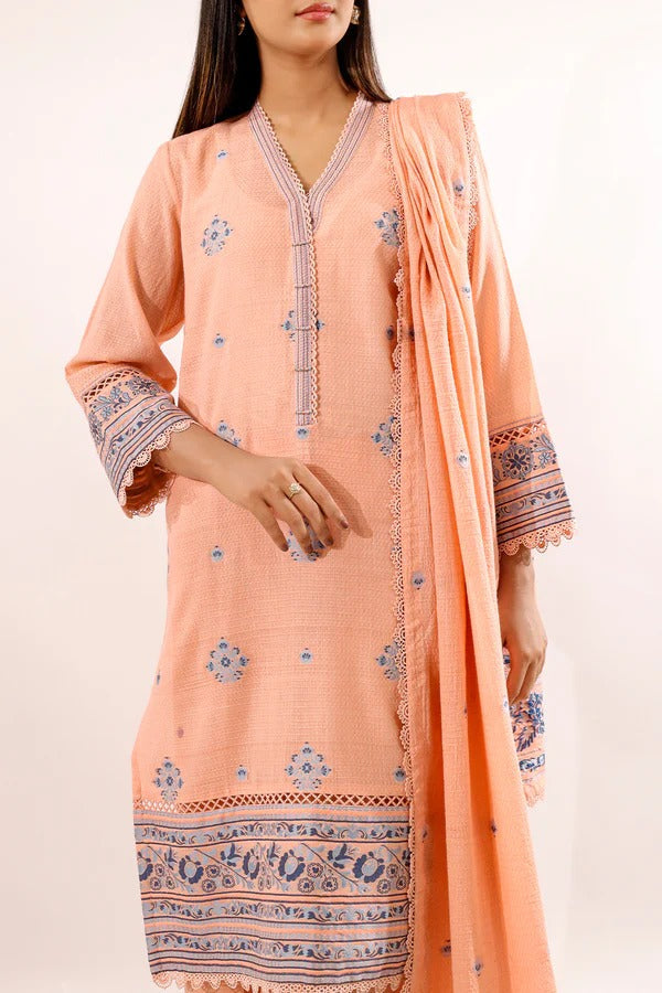 Step into graceful sophistication with the Saya Soft Peach Jacquard 3-Piece Suit. Crafted from premium jacquard fabric, it features delicate blue motifs and includes a shirt, trousers, and a coordinating dupatta. Perfect for festive occasions or formal gatherings, it combines comfort, elegance, and timeless style.